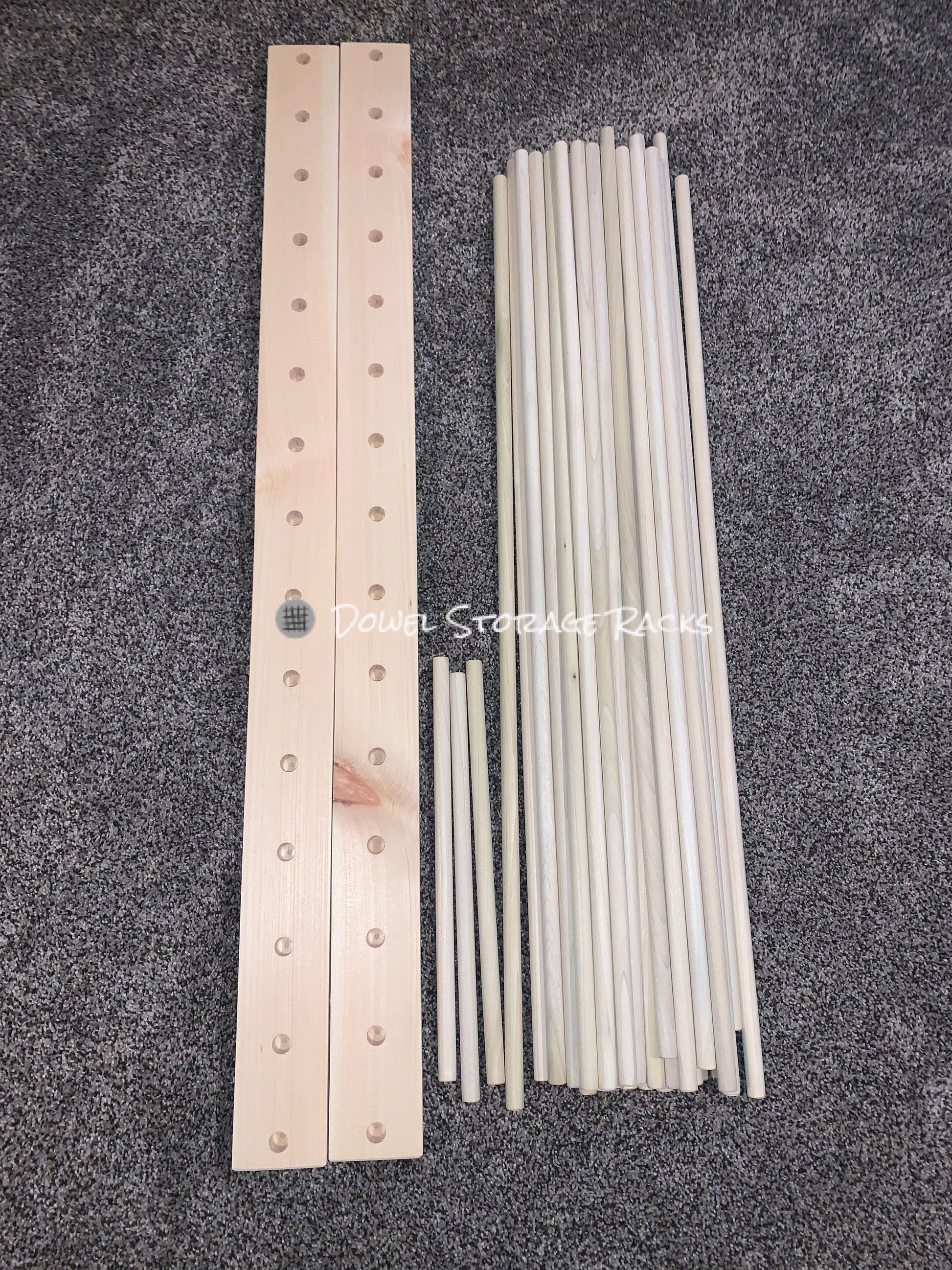The base is approximately 36” long x 16” wide with thirty (30) 1/2” thick wooden dowel uprights that are approximately 30” long. There is approximately 2” space in between the dowels creating 14 storage slots.