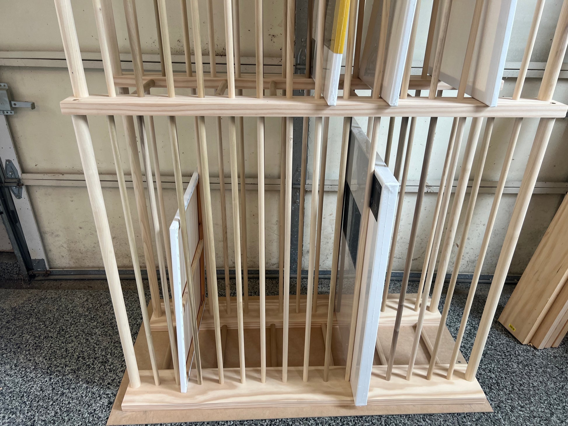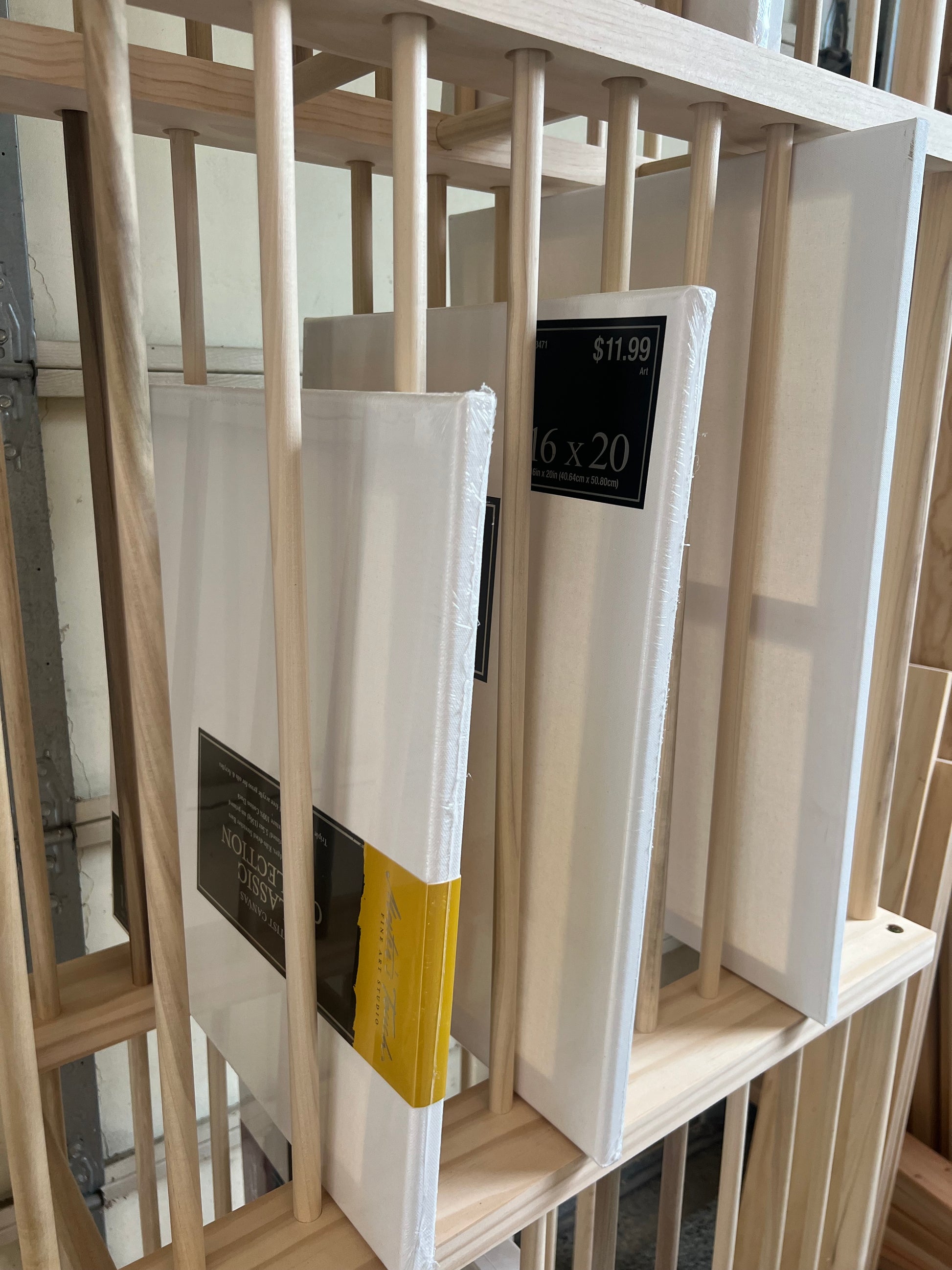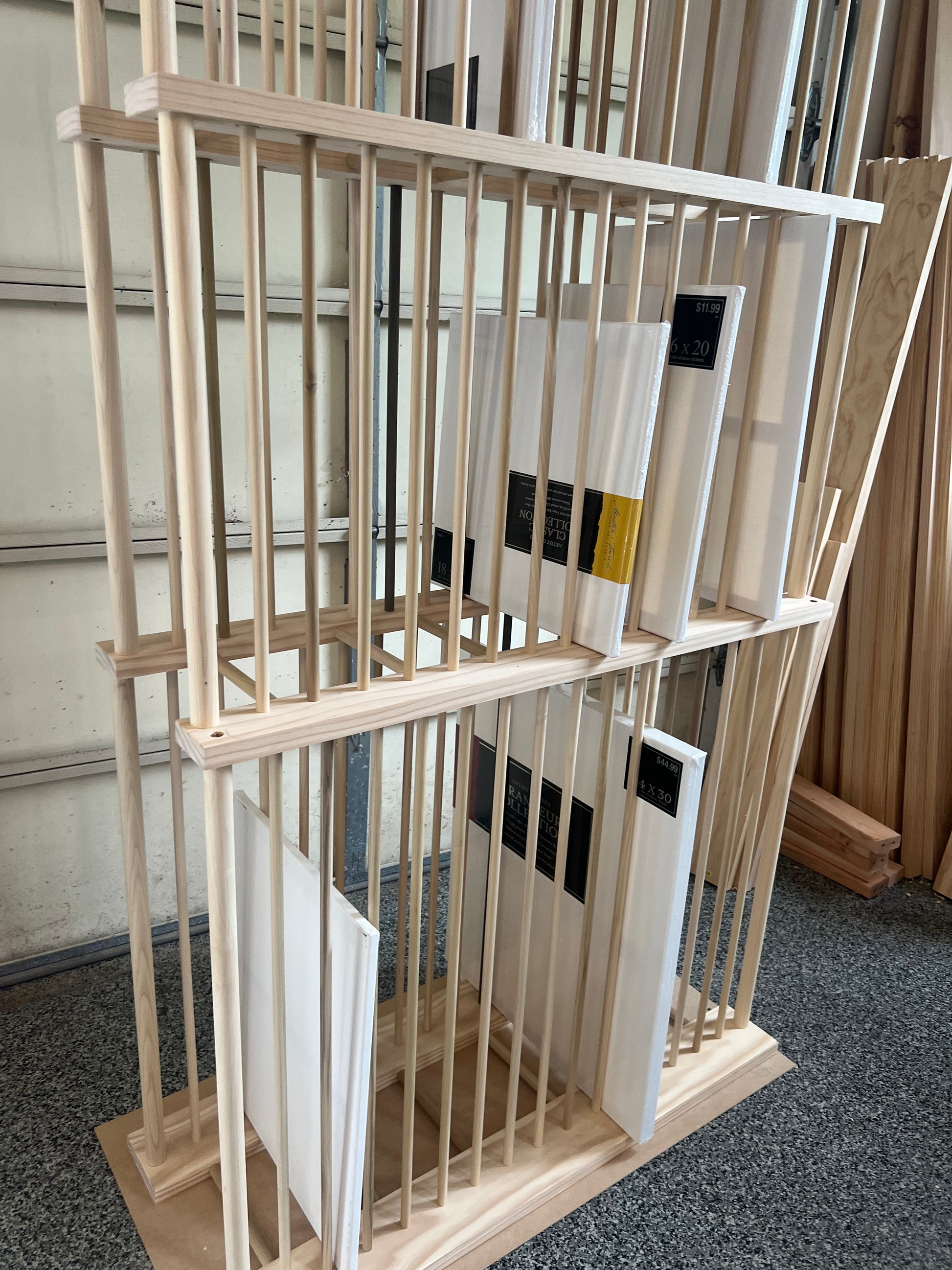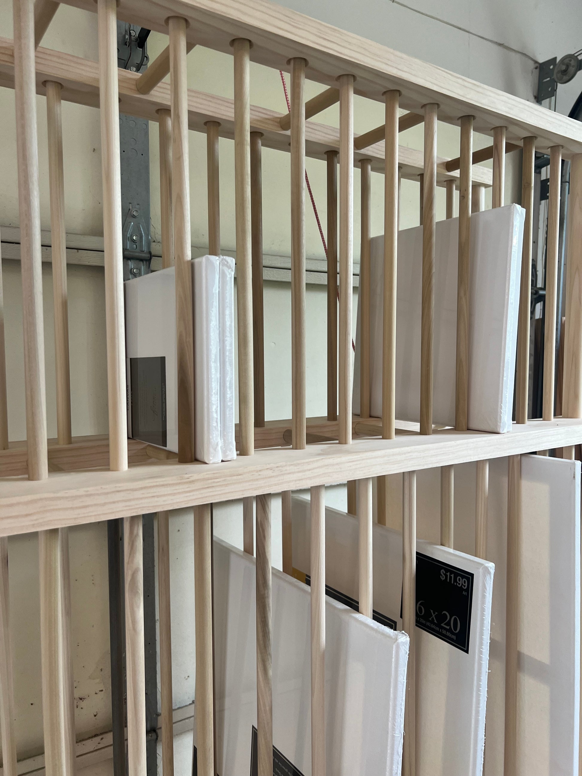 This rack has 16 2” wide storage slots on three levels and is designed to hold Art Canvas up to 36” on the bottom section, 24” tall on the mid section and 18” tall on the top section.