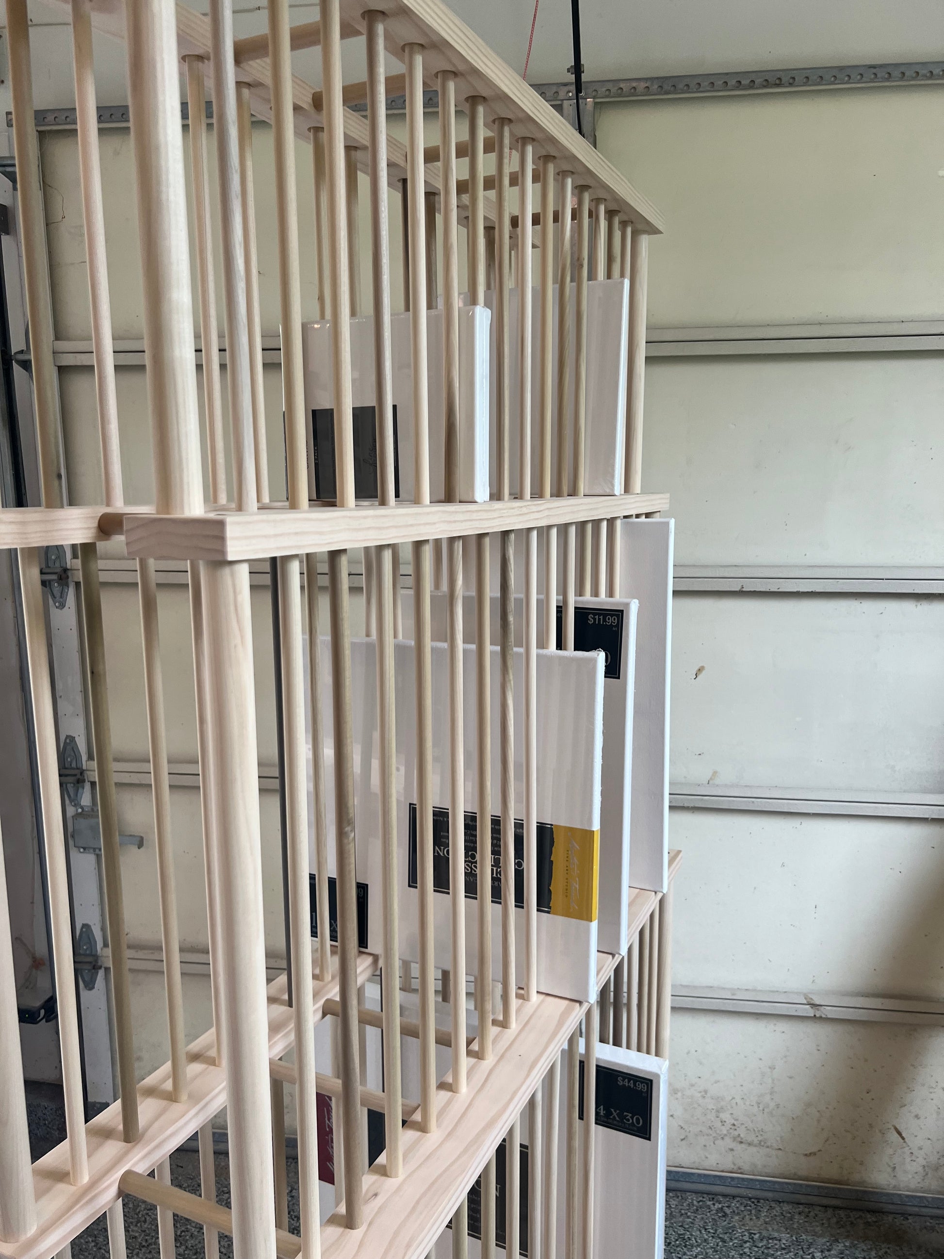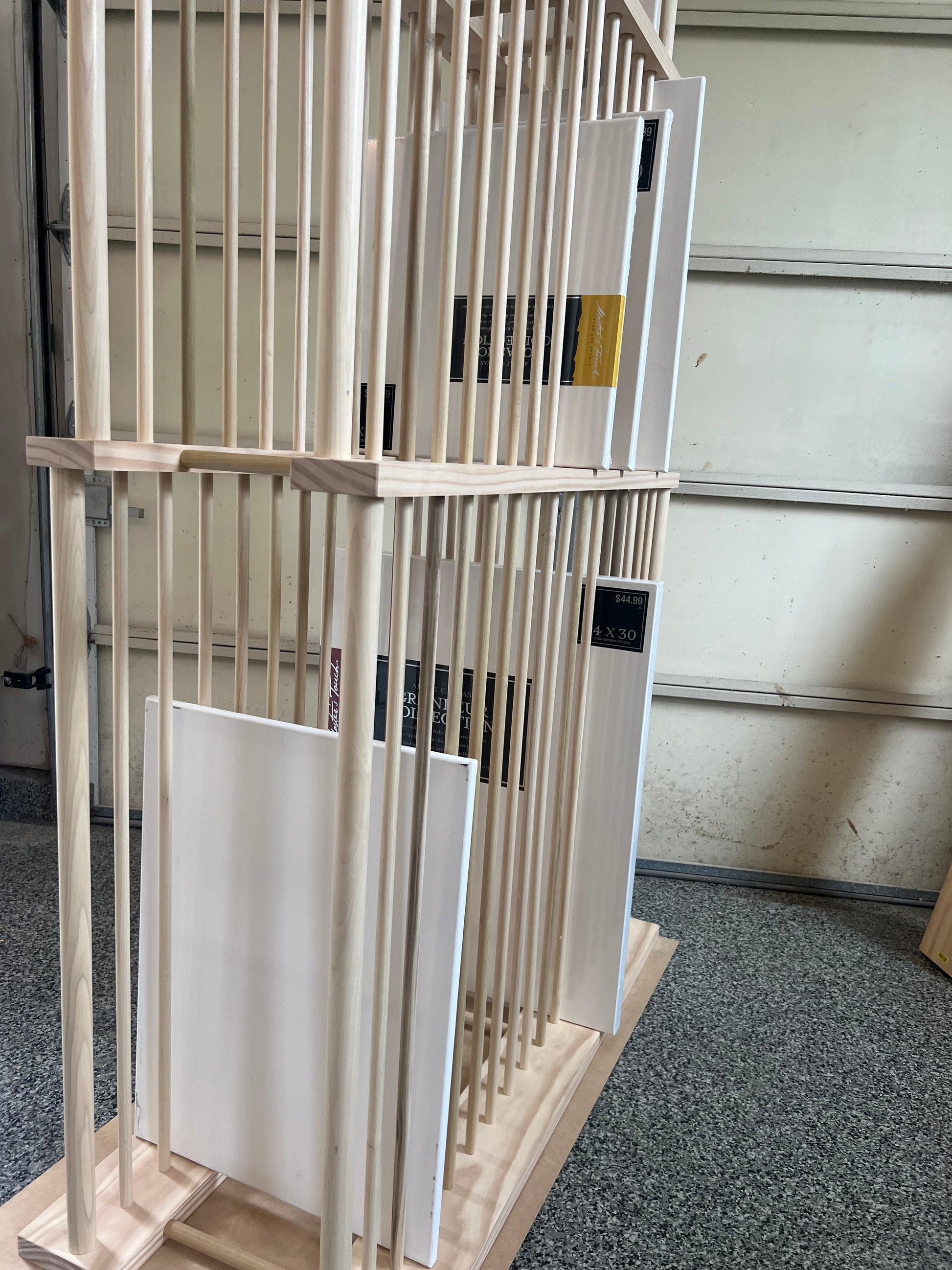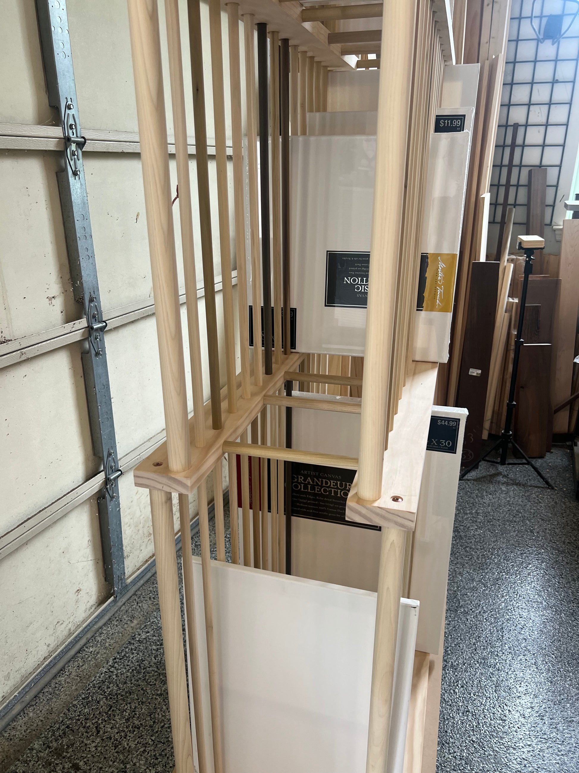 This rack has 16 2” wide storage slots on three levels and is designed to hold Art Canvas up to 36” on the bottom section, 24” tall on the mid section and 18” tall on the top section.