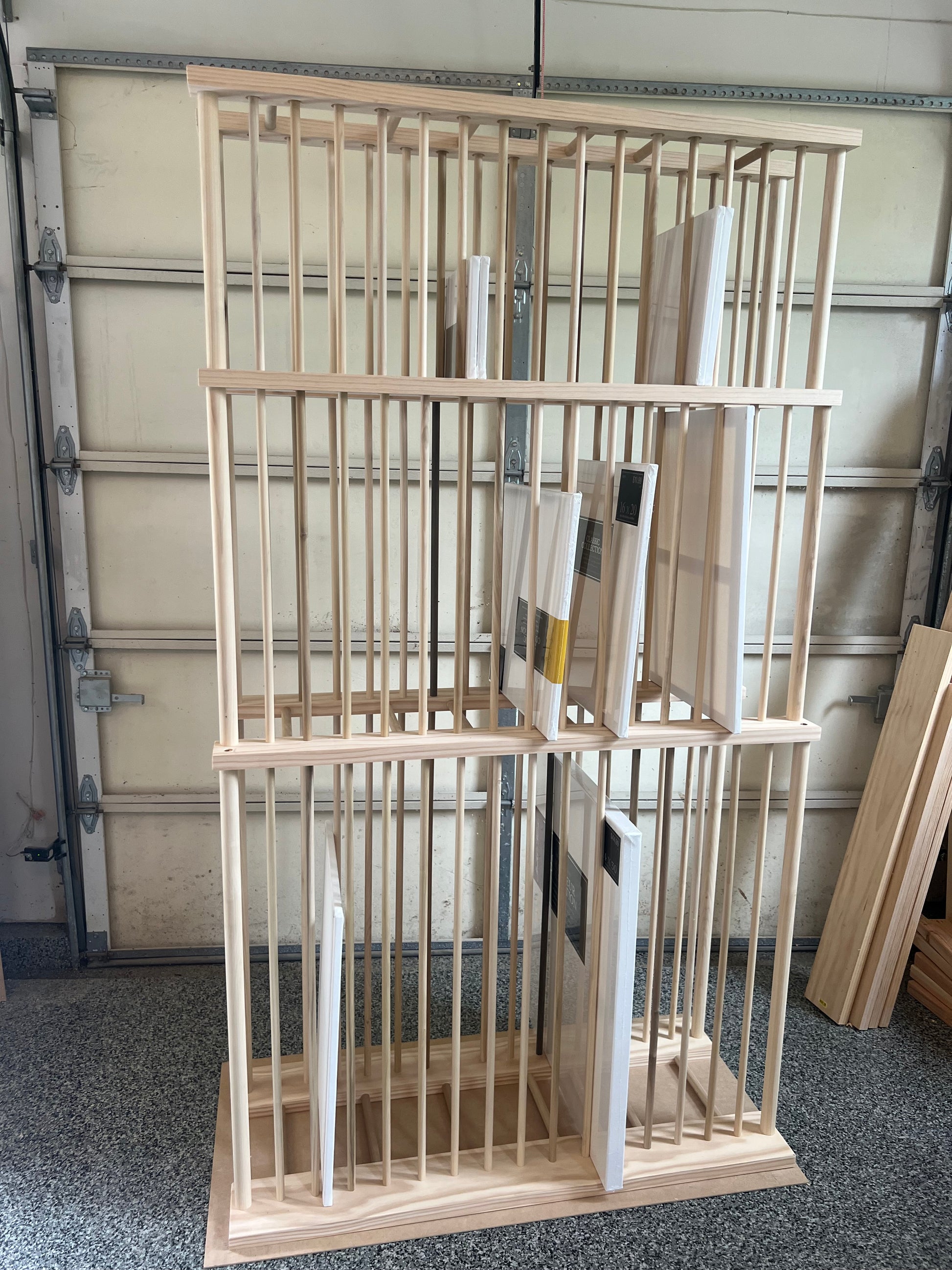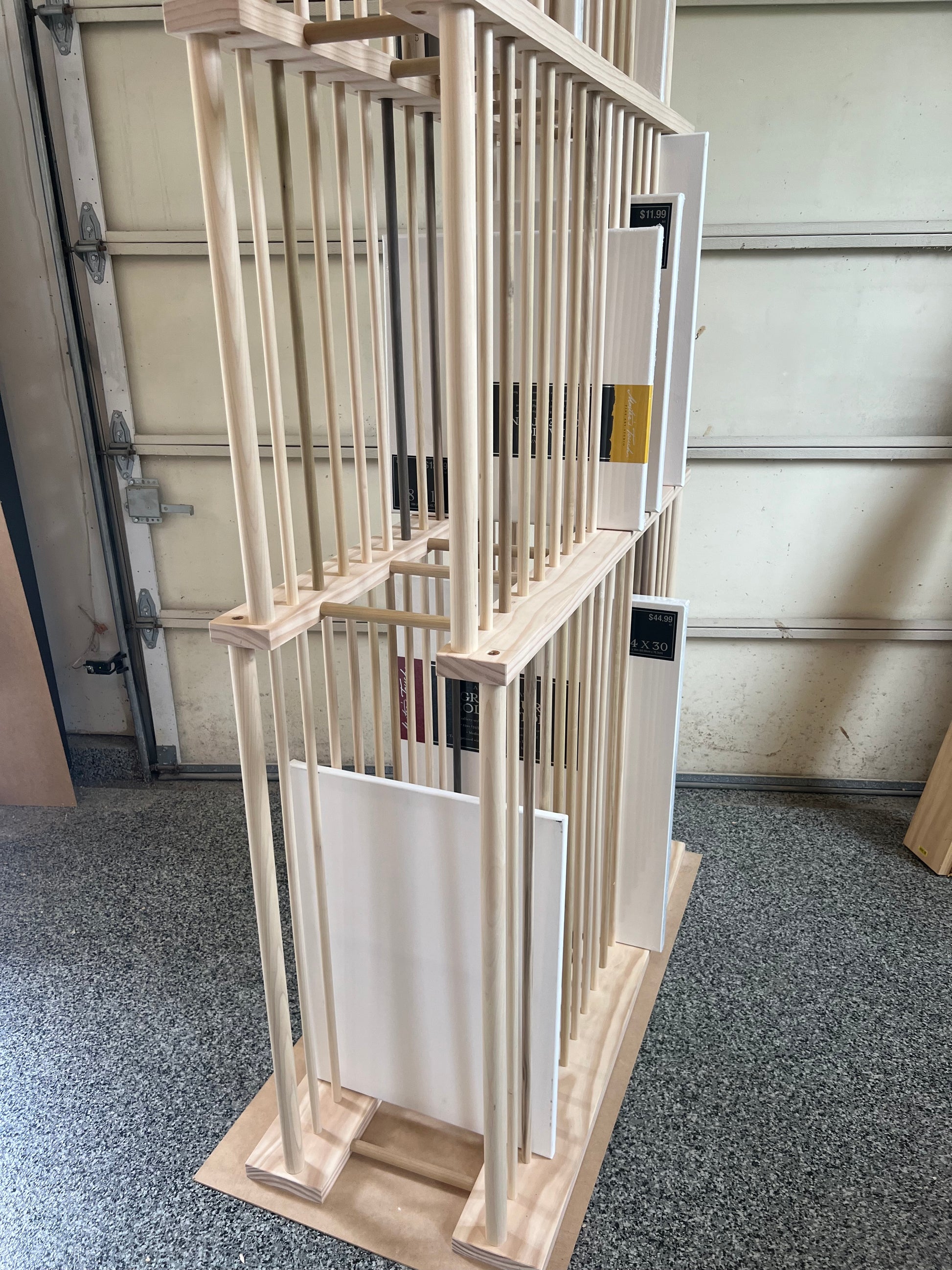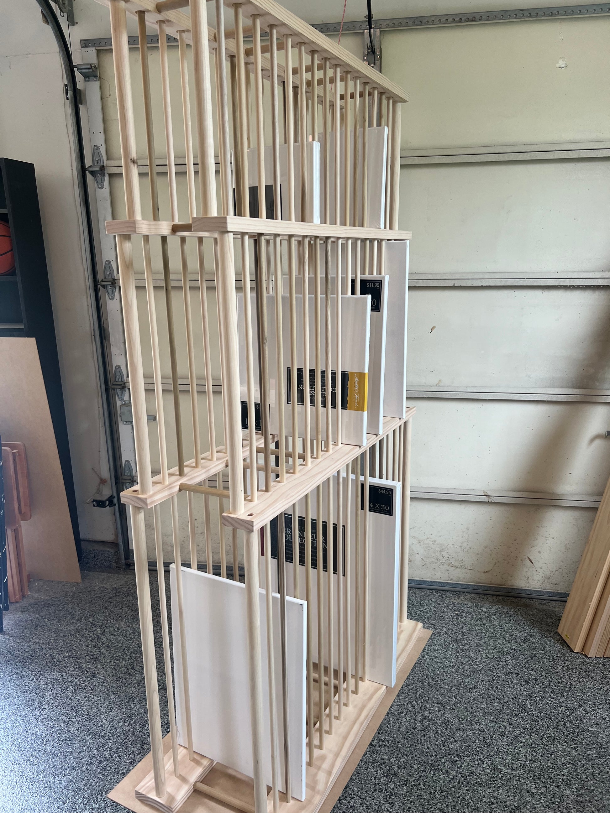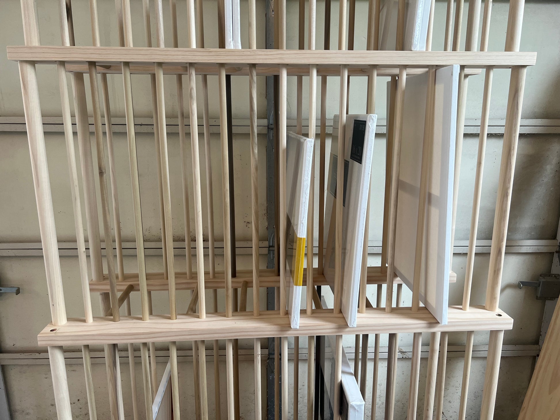 This rack has 16 2” wide storage slots on three levels and is designed to hold Art Canvas up to 36” on the bottom section, 24” tall on the mid section and 18” tall on the top section.