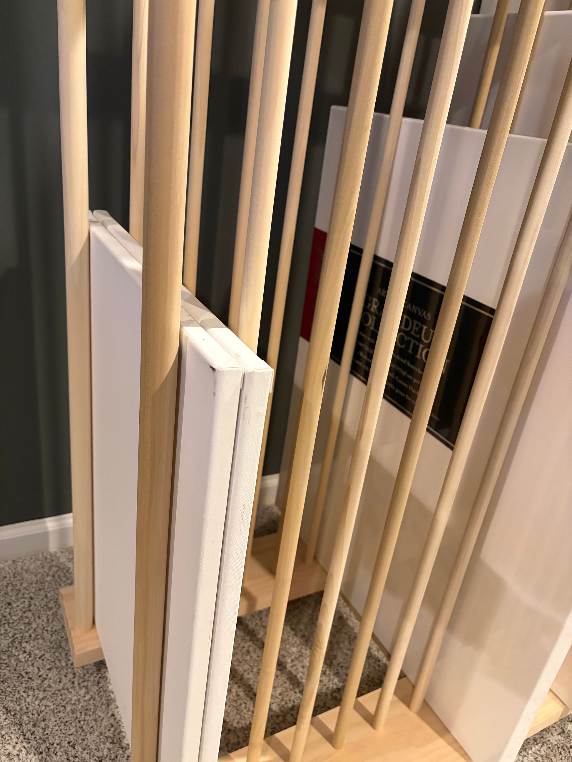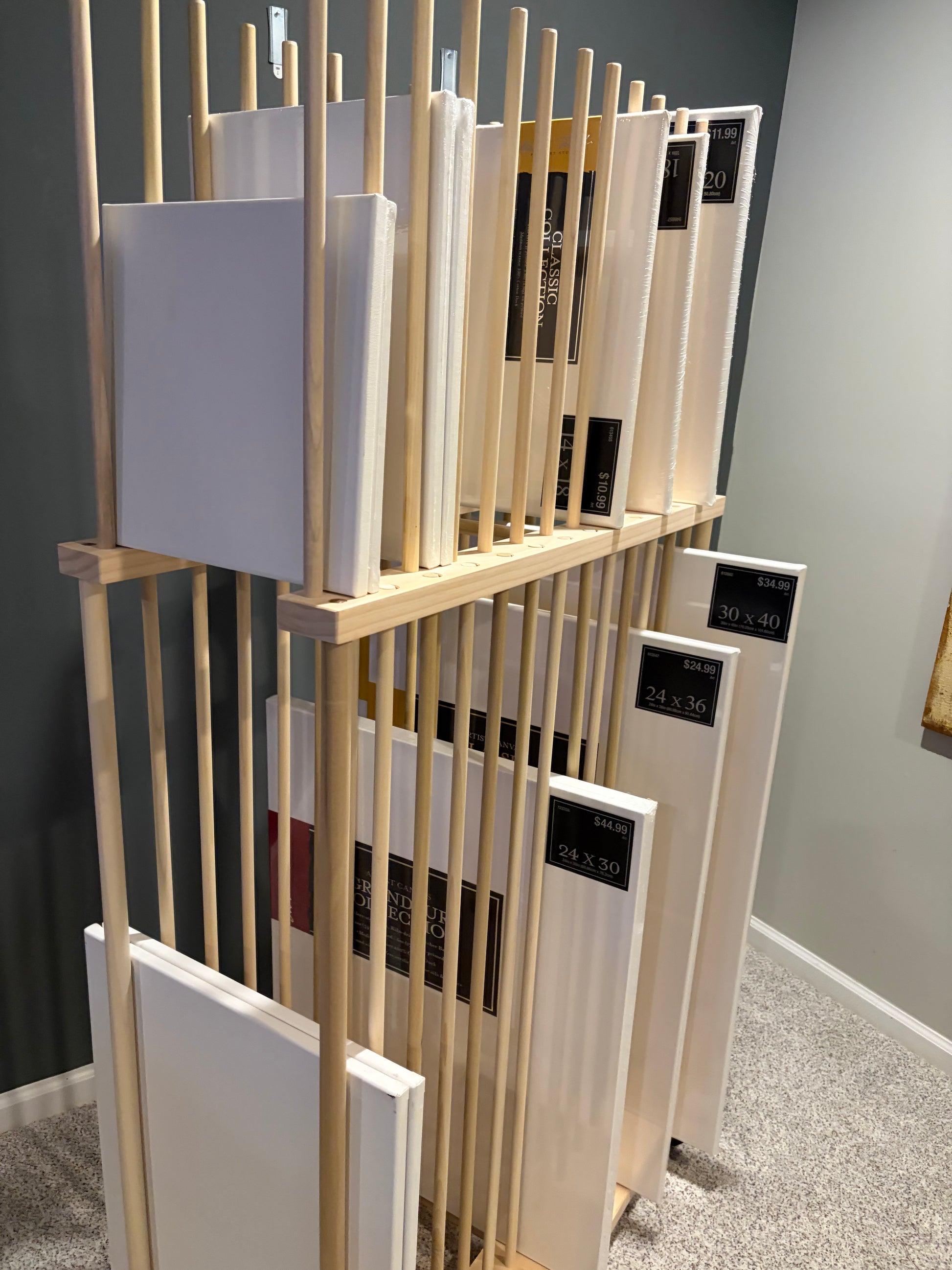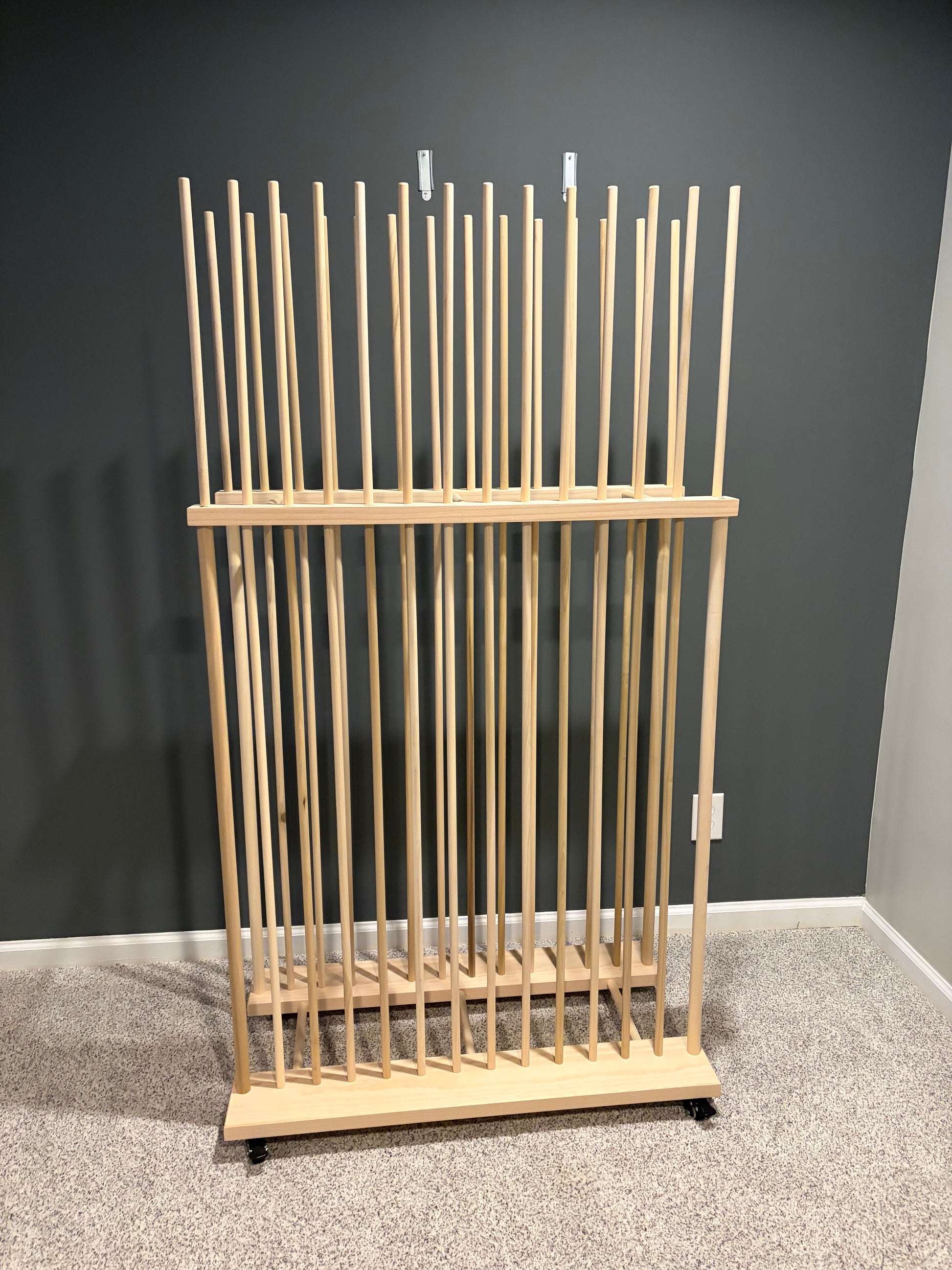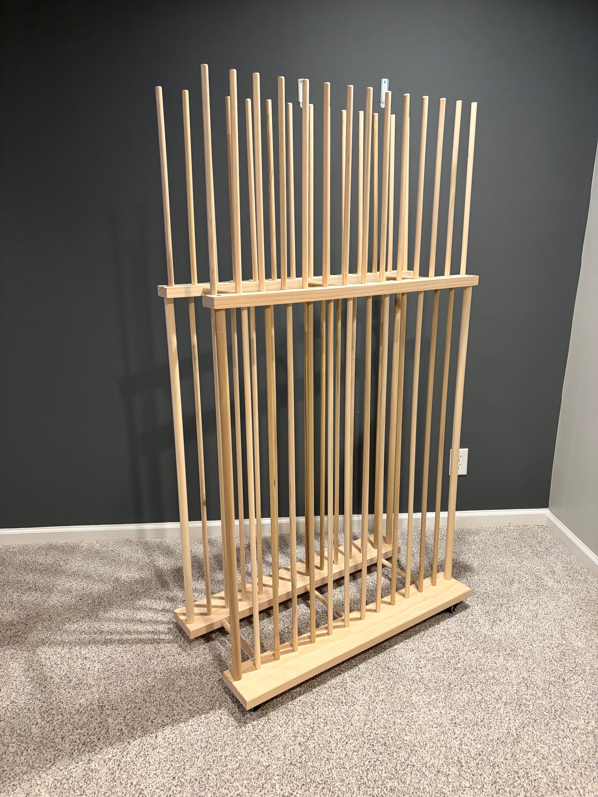 Two Tier Art Storage Rack with locking caster wheels on all four corners. This is made with a thicker 5/8” Poplar dowel and high quality premium pine base material