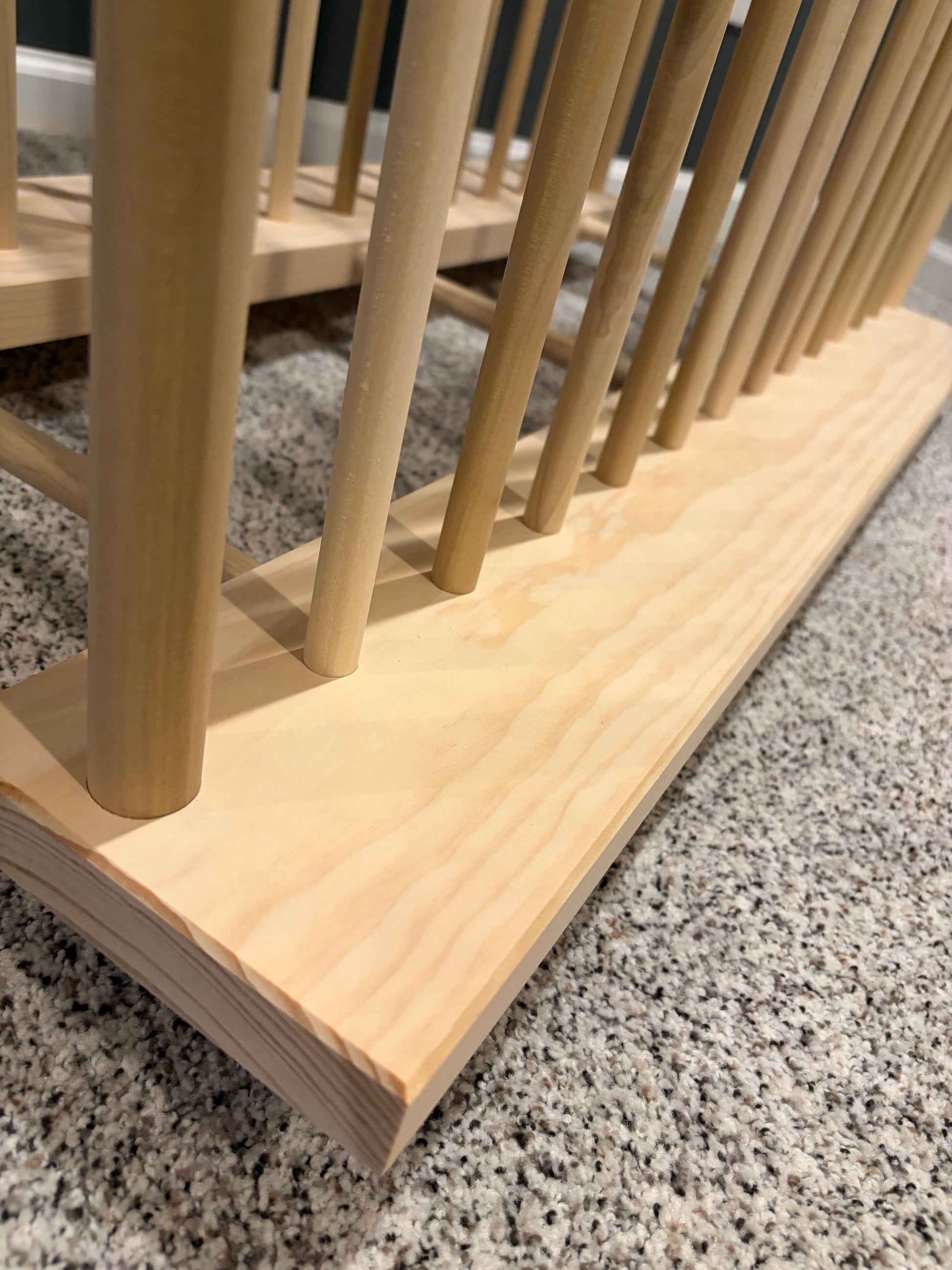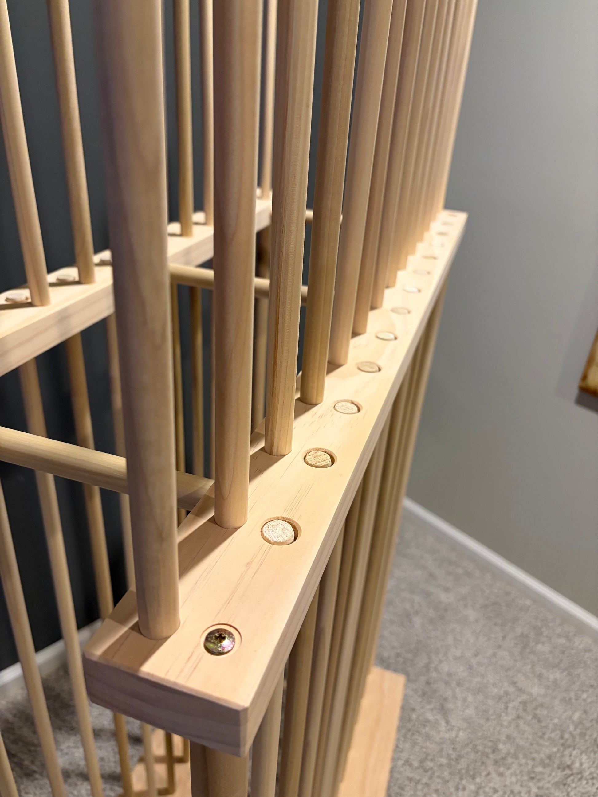 - Made with thicker 5/8” dowels which run full length on bottom section and are recessed into underside of upper tier.