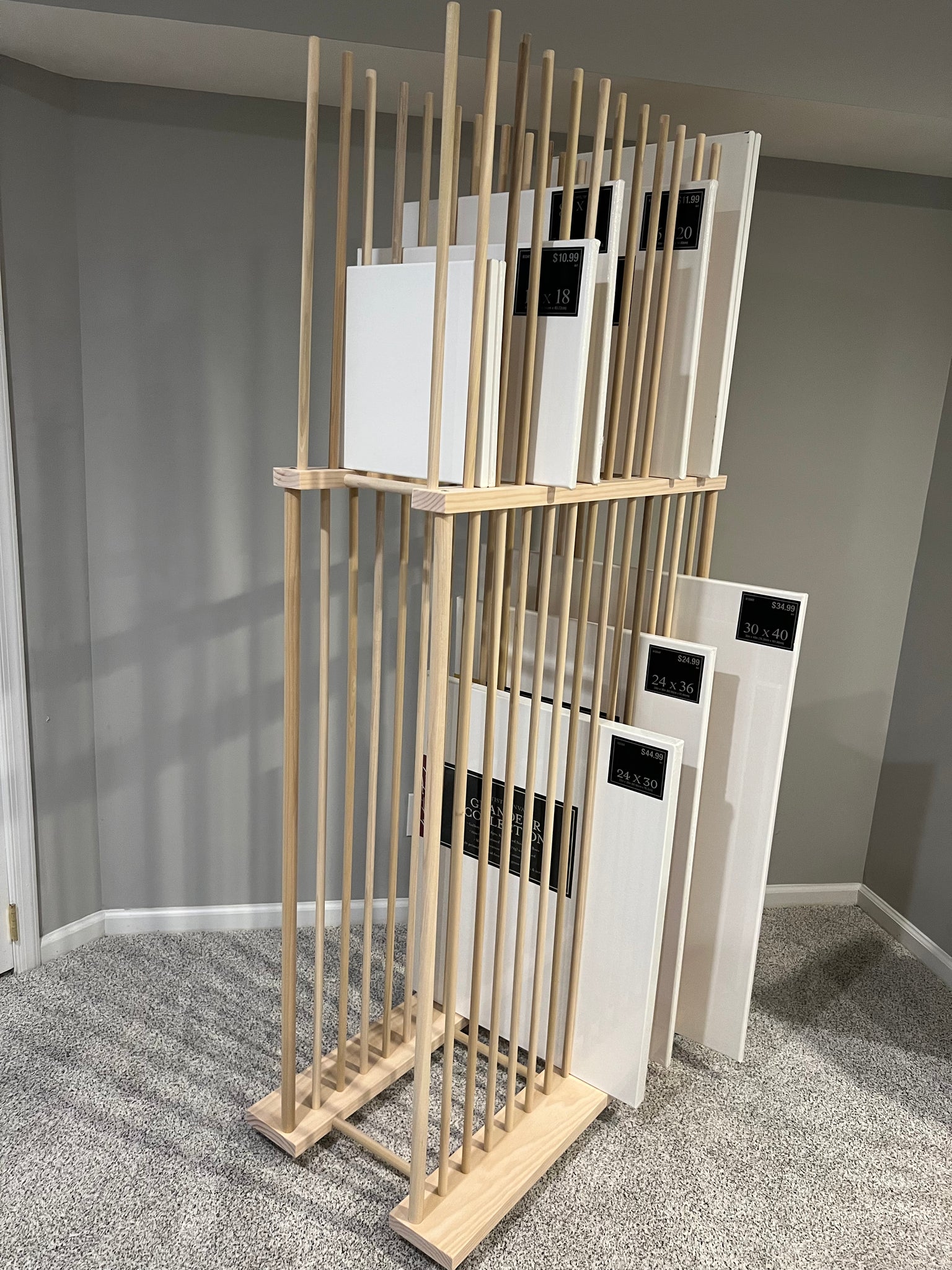 Two Tier Art Storage Rack with locking caster wheels on all four corners. This is made with a thicker 5/8” Poplar dowel and high quality premium pine base material